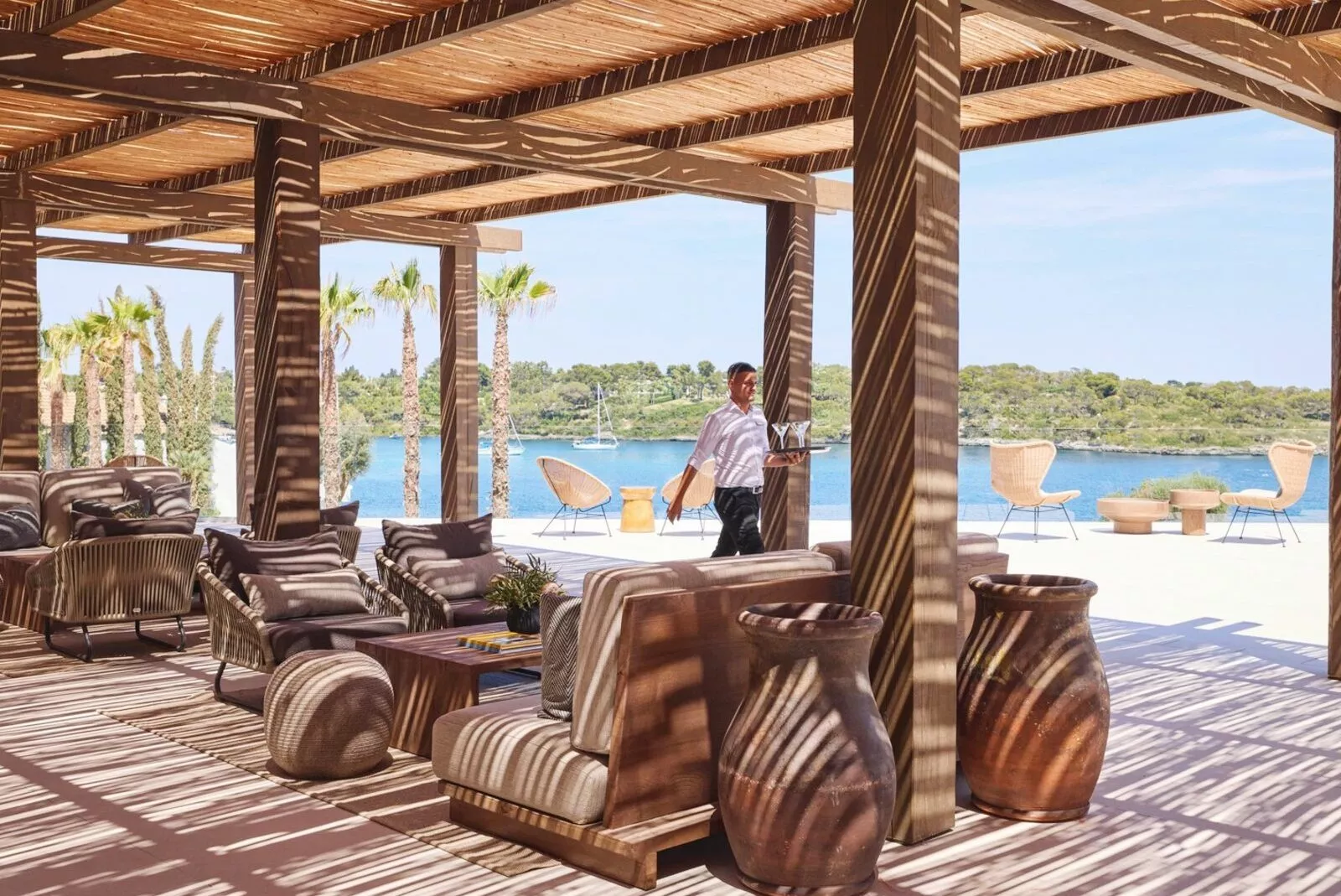 Ankommen Alles hier ist grandiose Aussicht – auf das von drei Landzungen gerahmte Mittelmeer oder ins Grün des Kiefernwalds, in dem sich die 319 Zimmer und Villen verstecken. Manche mit Privatpool, alle im lässig-eleganten Insel-Schick.